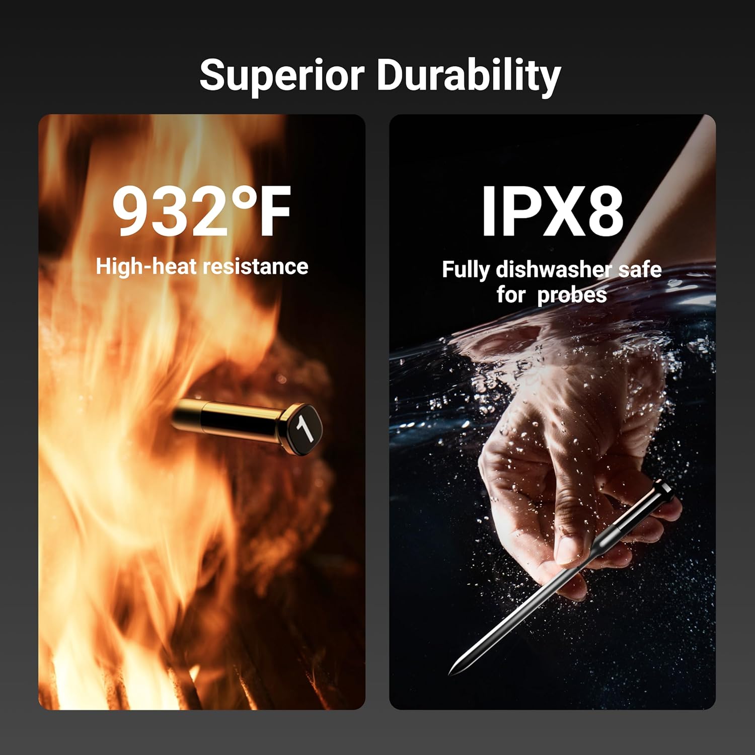 • Two Ultra-Thin Probes: Allows you to monitor time and temperature for two different dishes at once. The ultra-thin design preserves the integrity of your proteins and retains their juices, ensuring perfectly cooked meat every time.