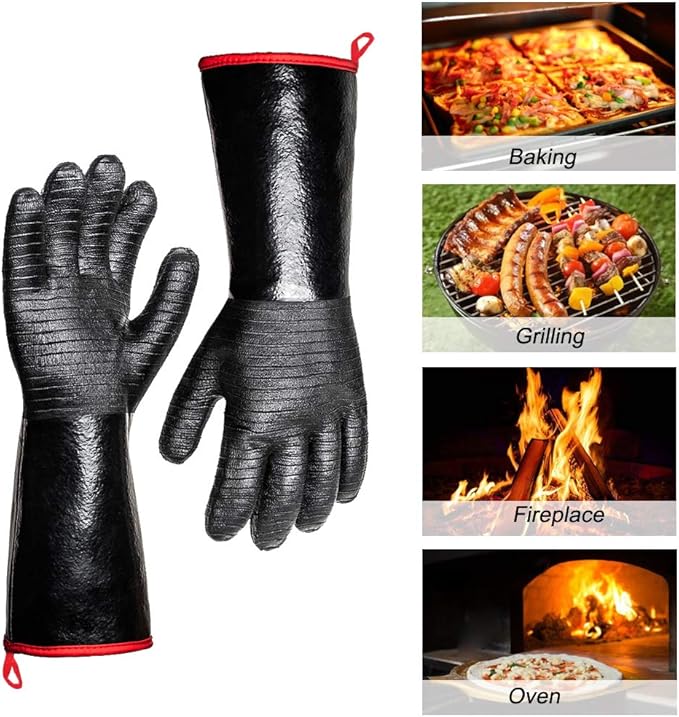 • SAY GOODBYE TO BURNS! At 14” inches long, our BBQ gloves better protect fingers, hands and wrists from burns. And Our cooking gloves are heat resistant up to 932°F / 500°C .use this bbq accessories for your turkey fryer ,campfire,fireplace,charcoal,pit & barbecue gas grills as well