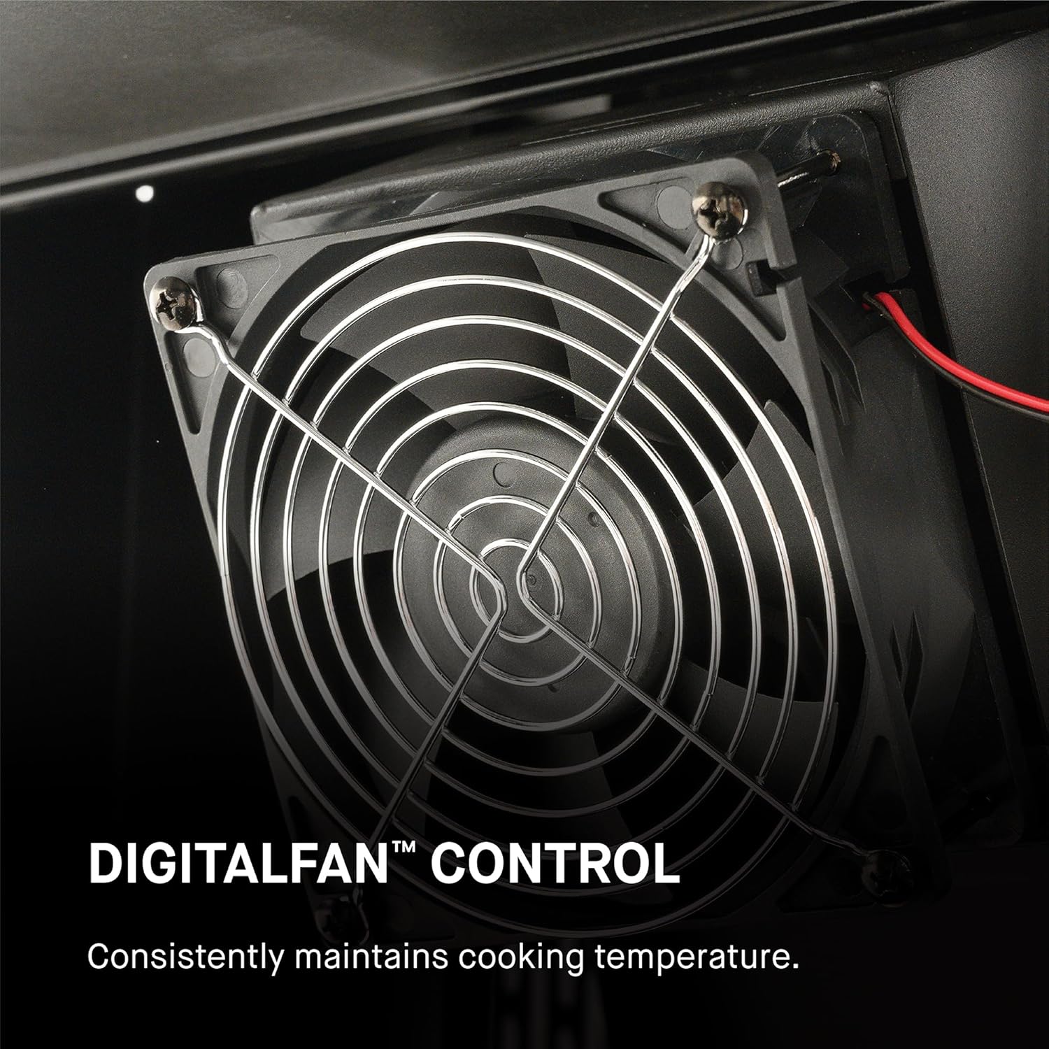- DIGITALFAN AUTOMATIC TEMPERATURE CONTROL – DigitalFan precisely maintains desired grilling or smoking temperature from 225° – 700°F for low-and-slow smoking or high-heat searing methods.
