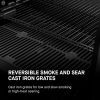 - Includes reversible cast iron grates for high heat searing or low and slow smoking methods.