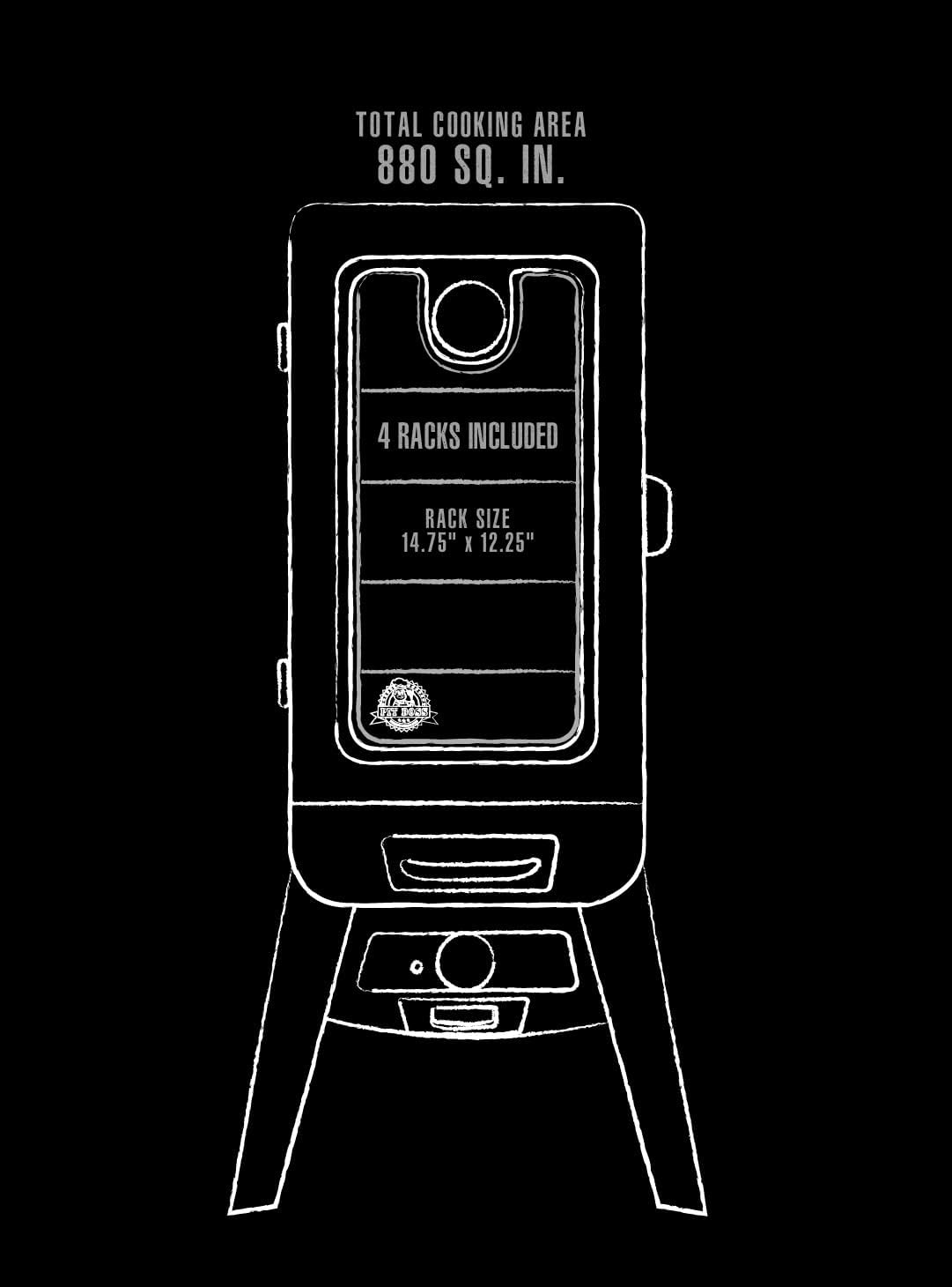 • 880 sq. inch cooking area; 4 racks that measure 14.75″ x 12.25″ each