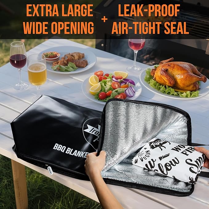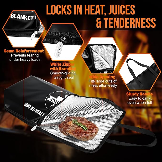 - LOCKS IN HEAT, JUICES & TENDERNESS – Forget dry, overcooked meat—our bbq blanket for resting meat features a premium triple-layer build with 3mm thick aluminum foil insulation that holds heat like a champ. It maintains the perfect resting temperature, allowing your brisket, pork, or turkey to reabsorb every drop of flavor-packed moisture. This insulated meat resting bag—also known as a bbq blanket drip ez, meat blanket, or drip ez bbq blanket—delivers tender, juicy results every time.