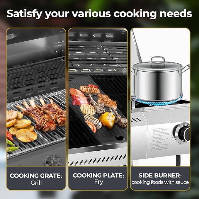 - MULTIPLE COOKING METHODS AND EXTRA LARGE COOKING AREA: Three cooking methods at your disposal (fry, grill, boil): grill pan, grill, and side burner.326.65 sq. in. grilling area and 124.80 sq. in. heating area.No need to wait long time to enjoy a delicious meal.
