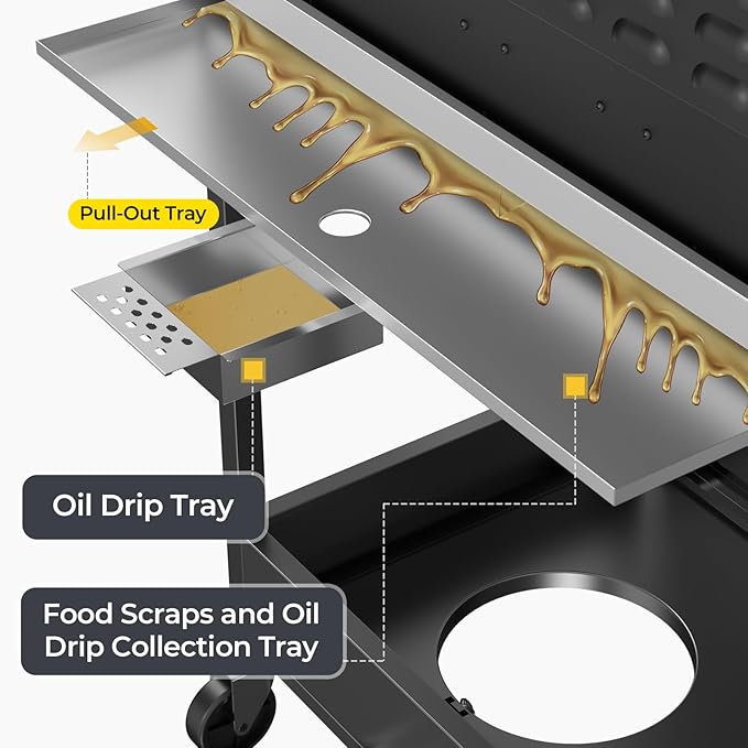 - EASY TO CLEAN AND MOVE: The grill is equipped with a removable food residue collector and grease drip collection box underneath the grilling area of the grill.Easier to clean food residue and grease.The grill is made of 304 stainless steel is also easy to clean.Four casters with no dead angle (two of them are equipped with brake) make it easy to move around and at the same time, it can also be stopped steadily.
