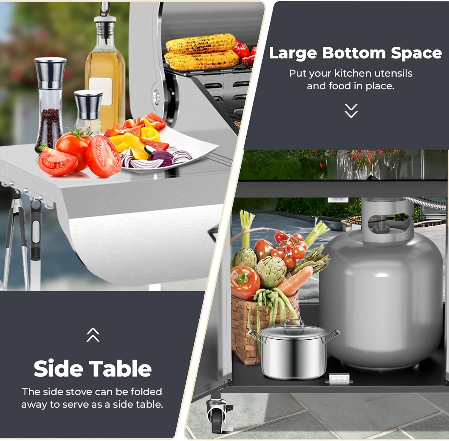- FULL FUNCTIONALITY: The gas grill comes with a dust cover with handle, thermometer, side hooks, side place settings, towel rack and a bottle opener that may be needed for get-togethers, and underneath the body of the grill you can place gas canisters and tools ingredients, etc.It is fully functional, has plenty of storage space and feels good to use.