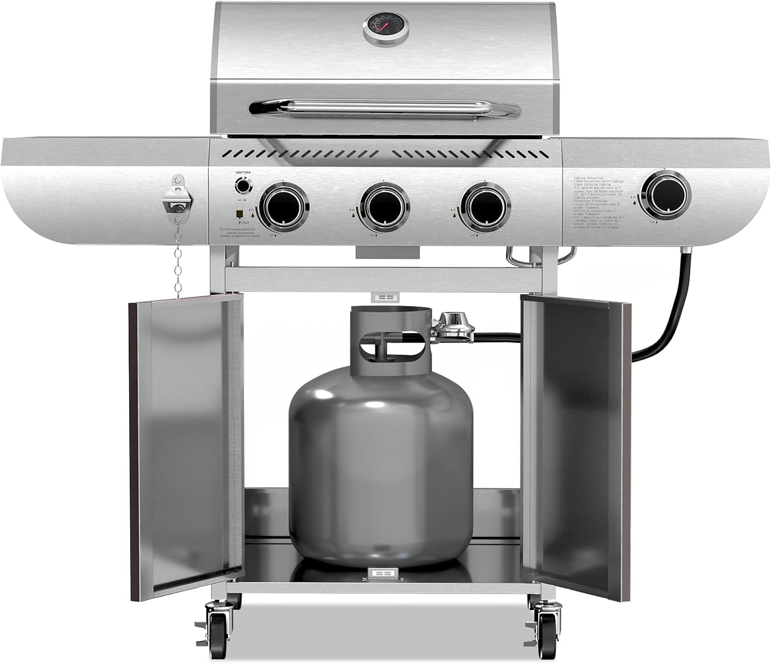 - EXCELLENT COOKING PERFORMANCE: The propane barbecue grill equipped with multiple burners for even heat distribution, cooking is fast with excellent results. The grill area features 3 main propane gas burners (8,000 BTUs each) and a side burner with lid (10,000 BTUs) that heat up quickly for a high-performance grilling experience.The stainless steel grill’s 4 burners have a total of 34,000 BTUs.