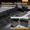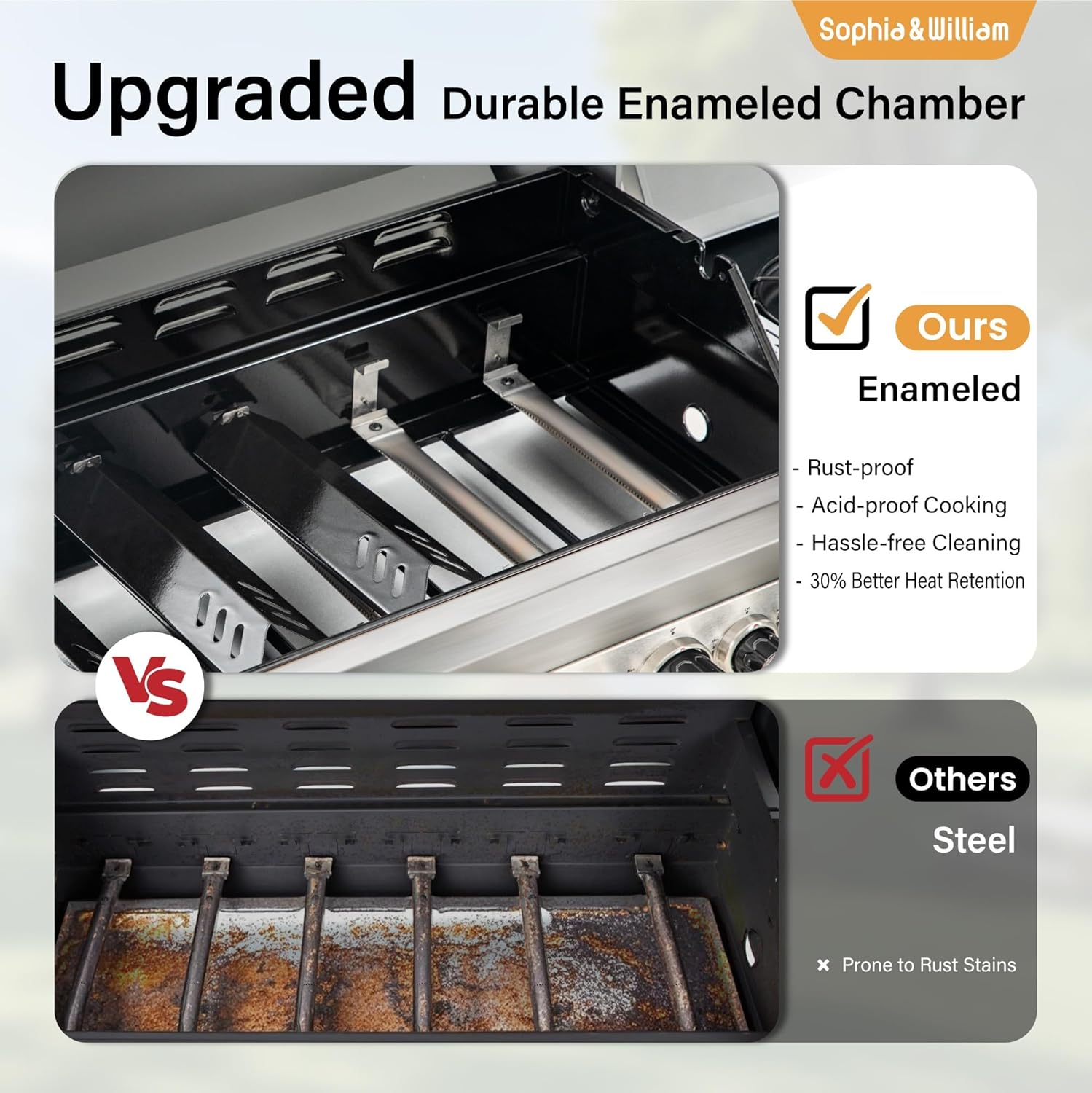- 𝗗𝘂𝗮𝗹-𝗙𝘂𝗻𝗰𝘁𝗶𝗼𝗻 𝗣𝗼𝗿𝗰𝗲𝗹𝗮𝗶𝗻-𝗘𝗻𝗮𝗺𝗲𝗹𝗲𝗱 𝗖𝗮𝘀𝘁 𝗜𝗿𝗼𝗻 𝗚𝗿𝗮𝘁𝗲𝘀: Sophia & William 6-burner gas grill features innovative grill griddle combo grates, offering authentic sear marks on one side and a flat-top cooking surface on the other. Made from heavy-duty cast iron for superior heat retention, the reversible design provides ultimate versatility – perfect for steaks, burgers, pancakes, and stir-fry. Enjoy professional results and effortless cleanup with this all-in-one outdoor cooking solution