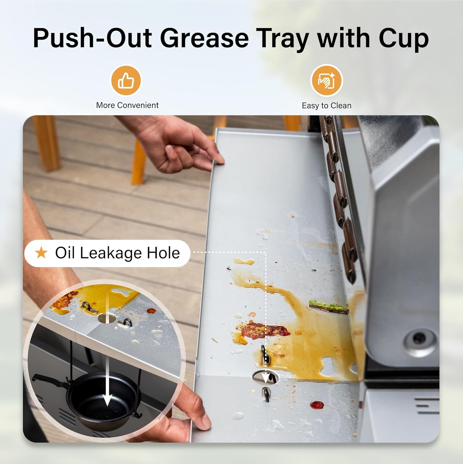 - 𝗘𝗮𝘀𝘆-𝗖𝗹𝗲𝗮𝗻 𝗖𝗼𝗻𝘃𝗲𝗻𝗶𝗲𝗻𝗰𝗲: The slide-out grease tray and removable drip pan make cleanup a breeze. Spend less time scrubbing and more time enjoying your gas BBQ grill – perfect for busy hosts who love hassle-free grilling